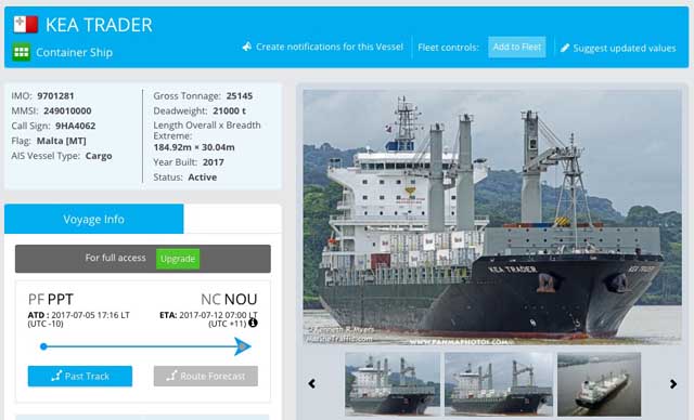 Le Kea Trader qui s'est échoué dans la nuit du 11 au 12 juillet à 50 miles nautiques au sud-est de Maré est un porte-conteneurs construit en 2017 par Guangzhou Wenchong Shipyard (Chine). Le navire bat pavillon maltais et son port d'attache est La Vallette.