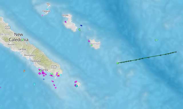 [9 heures] Le Kea Trader, un porte-conteneurs de 184 mètres de long battant en provenance de Papeete et à destination de Nouméa (tracé vert foncé sur la carte), s’est échoué sur les récifs Durand ce mercredi 12 juillet, à 01h18. Ces récifs (point vert clair) sont situés à 50 nautiques au sud-est de l’île de Maré. Aucun membre de l’équipage n’a été blessé lors de l’échouement, indiquent les autorités.