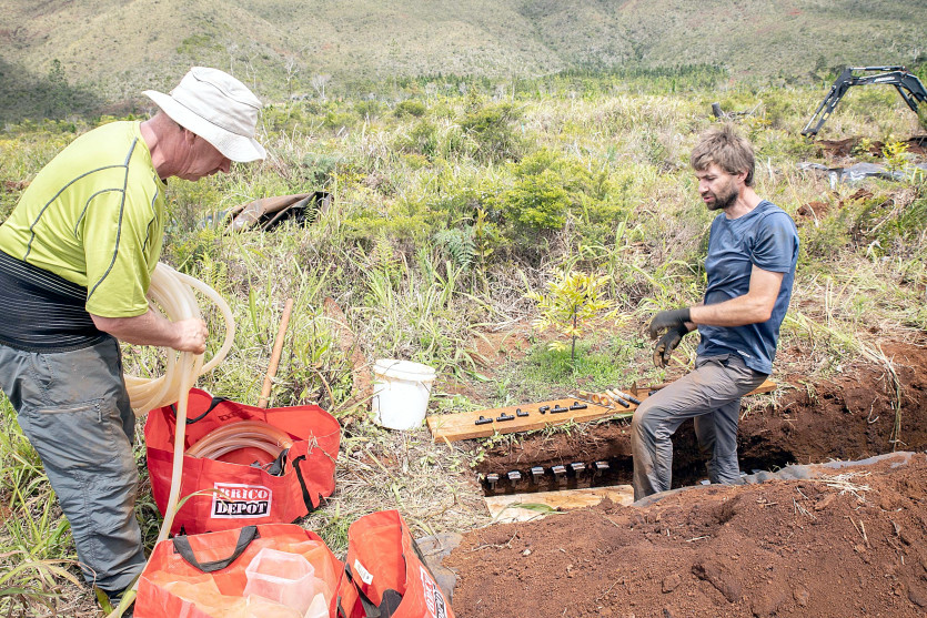 Serge Didier creuse une fosse à deux étages dans lesquels des gouttières seront installées.Cette eau récoltée intéresse tout particulièrement l’équipe de l’Institut agronomique néo-calédonien (IAC), menée par la chercheuse Audrey Leopold. Son analyse permettra de mesurer les éléments retenus, ou au contraire "relargués" en profondeur, par le sol, au pied du kaori. Matière organique dissoute, métaux, éléments nutritifs… l’équipe regarde tout en détail. Elle cherche notamment à vérifier si un compost végétal produit localement, naturellement chargé en métaux, peut être utilisé dans l’agriculture.