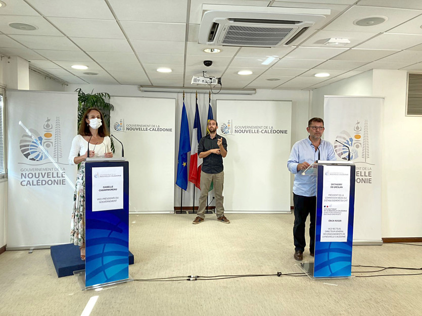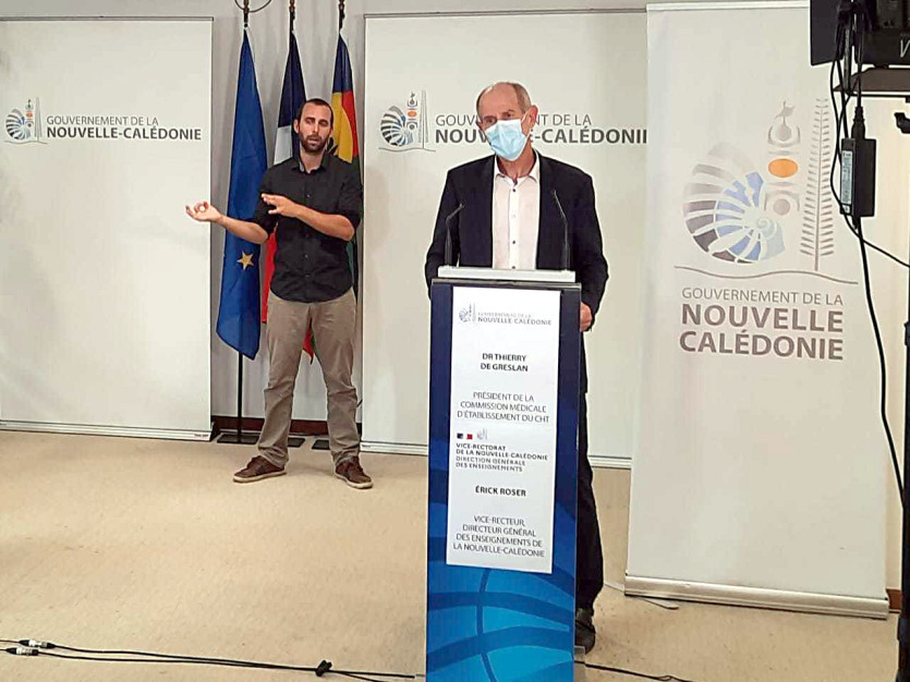 Isabelle Champmoreau et Erick Roser, vice-recteur de la Nouvelle-Calédonie se sont présentés à la conférence de presse du gouvernement afin de faire un point sur l’enseignement en Nouvelle-Calédonie. Le docteur De Greslan est lui en charge de faire le point sur la situation sanitaire.