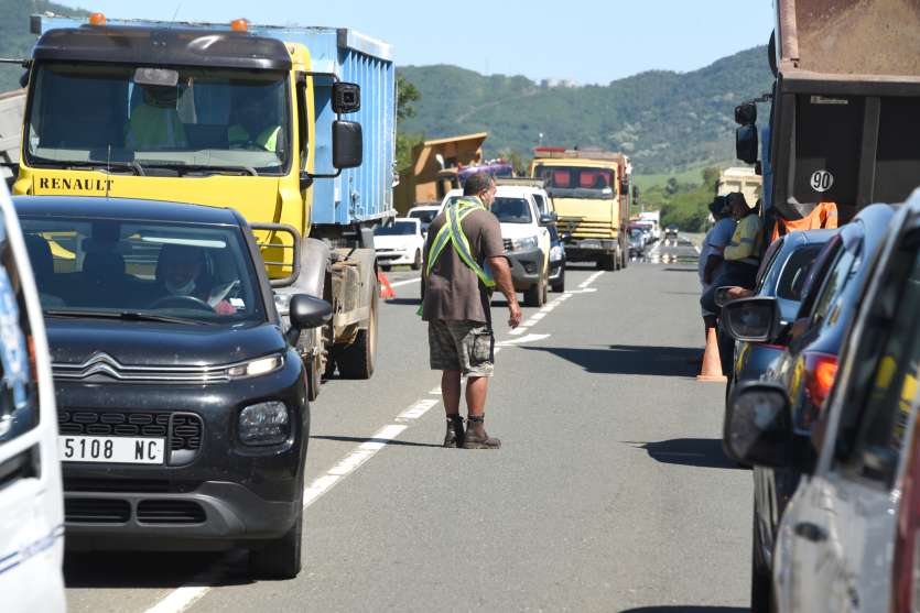 Des militants opposés à l’obligation vaccinale et au pass sanitaire sont mobilisés, depuis 5 heures du matin, à la sortie nord de Païta.