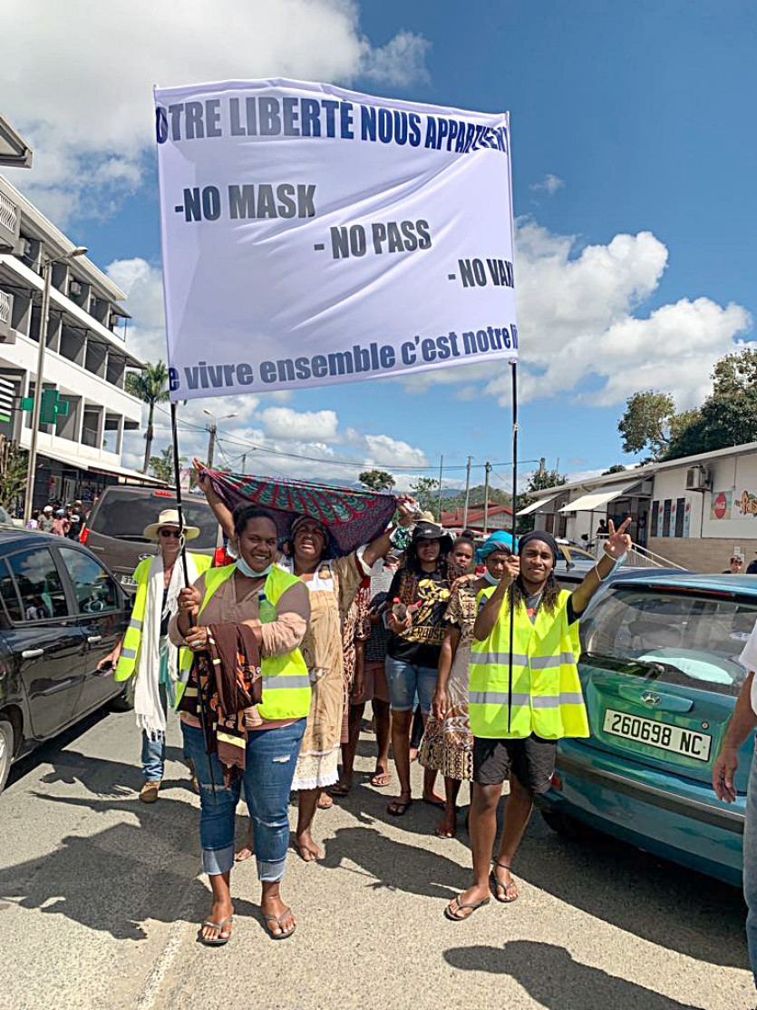 Ils manifestent contre l’obligation vaccinale et le pass sanitaire, en brandissant des banderoles "Notre liberté nous appartient". La marche est actuellement au centre du village de Bourail.