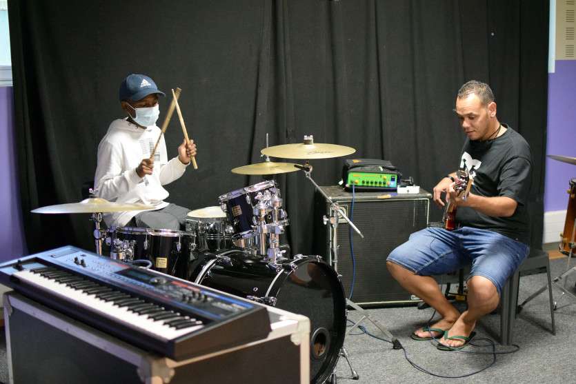 Jemuel, 14 ans, a retrouvé le Mouv' avec bonheur mercredi. Il a commencé par trente minutes de guitare avec Eric avant d’enchaîner avec trente minutes de batterie avec Miles. Des cours particuliers où le solfège et les accords s’apprennent en jouant des morceaux complets "pour qu’ils associent musique et plaisir", souligne Christophe Ventoume, le directeur de l’association créée en 1998. Qu’ils soient fiers, même après une seule séance de jouer devant la famille. La Mouv’skool compte une cinquantaine d’élèves et cinq intervenants qui donnent des cours particuliers de piano, guitare, batterie, basse et saxo et animent des ateliers de découverte des instruments et de pratique collective pour amener les jeunes musiciens à la scène. Les cours et les ateliers ont repris mercredi donc, mais il est toujours possible de s’inscrire pour 2 000 francs par mois.