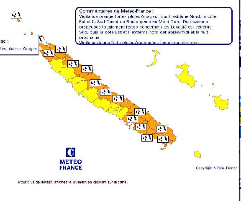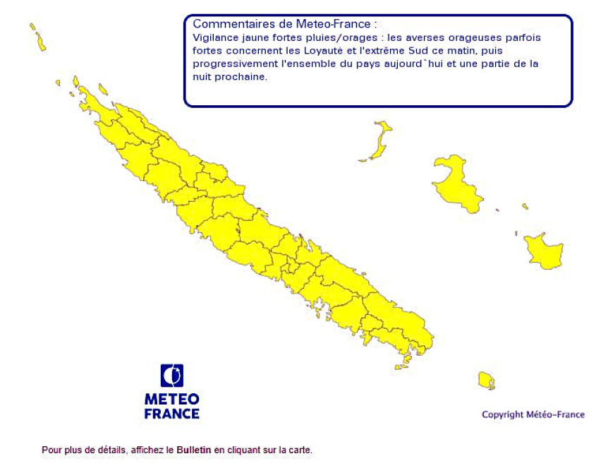 [9 heures] Météo France NC a placé en vigilance jaune "Fortes pluies et orages" l'ensemble des communes du pays.