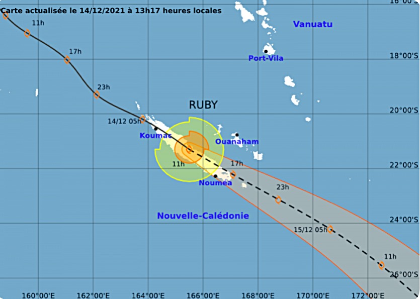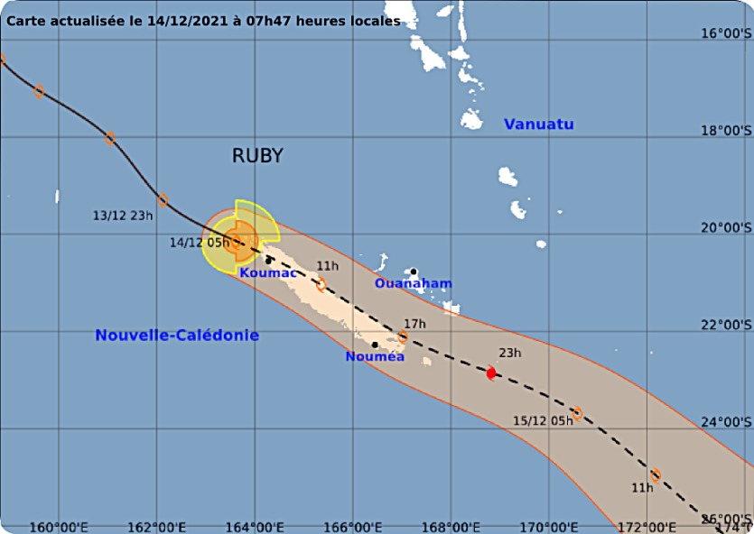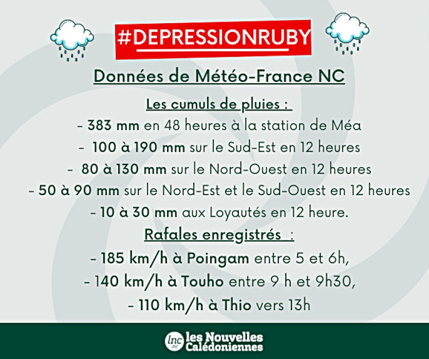- Brice Bacquet et Jean-Alexis Gallien-Lamarche | Crée le 14.12.2021 à 06h30 | Mis à jour le 15.12.2021 à 11h25ImprimerMétéo France Photo Météo FranceRetrouvez notre retour sur le passage de la dépression tropicale Ruby. Elle s’est éloignée de la Nouvelle-Calédonie dans la nuit du mardi 14 décembre, en passant à l’est de Kunié.