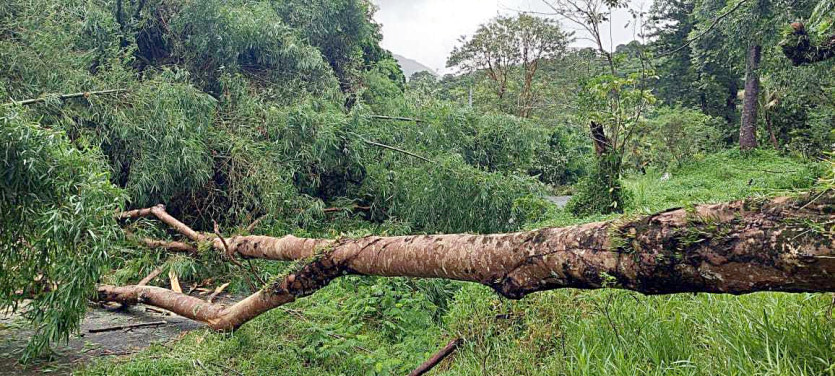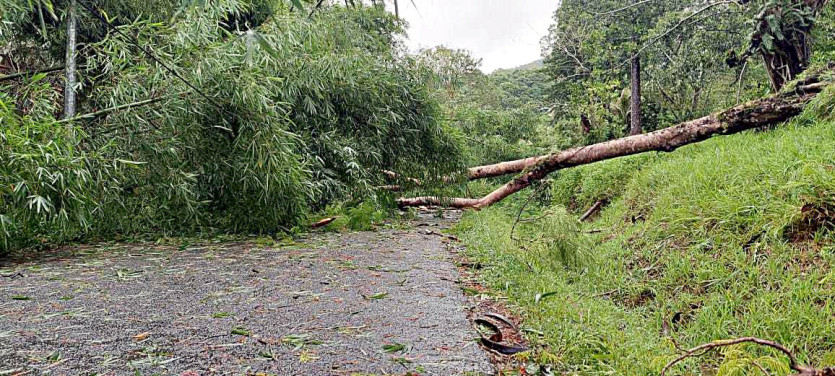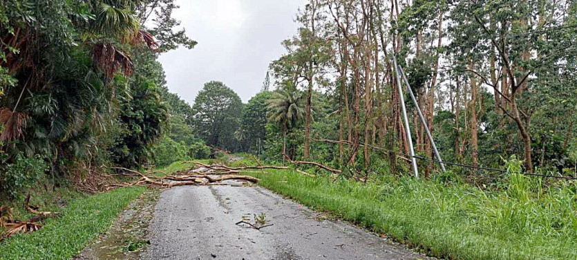 [10h31] L’accès à Hienghène est bloqué après l’aire du billet de 500 francs. Des arbres sont tombés sur la route. Dans leur chute, ils ont endommagé les lignes électriques.