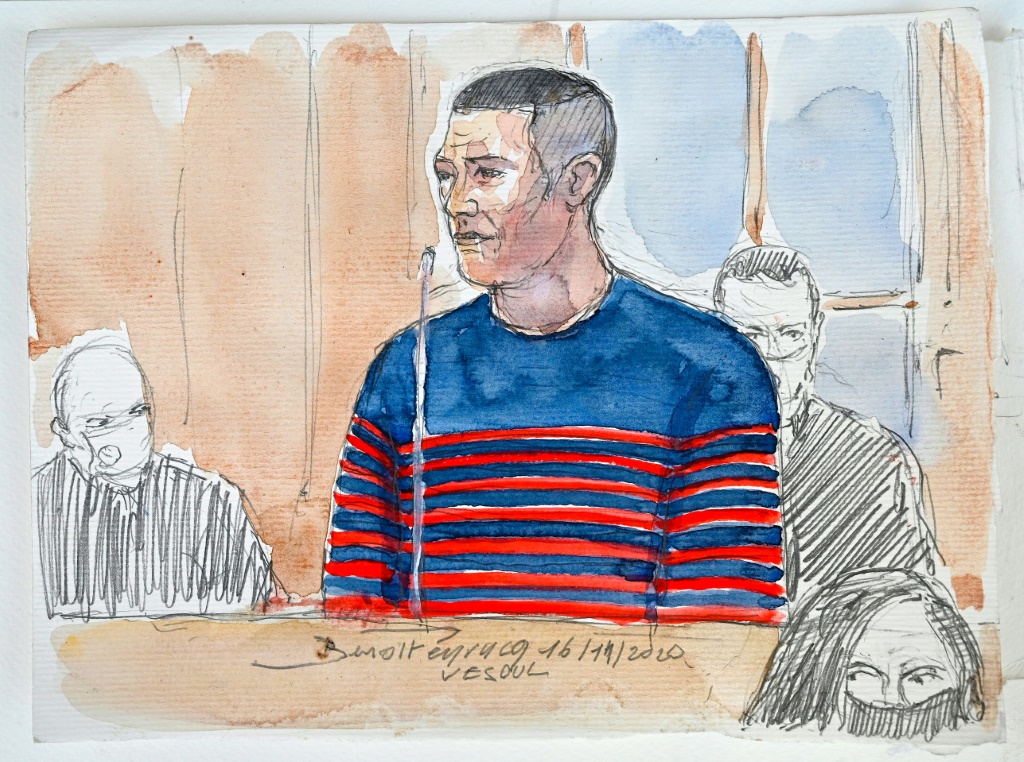 - © 2020 AFP | Crée le 16.11.2020 à 23h18 | Mis à jour le 16.11.2020 à 23h20ImprimerCroquis d'audience de Jonathann Daval, jugé devant la cour d'assises de la Haute-Saône, à Vesoul, le 16 novembre 2020 BENOIT PEYRUCQ-AFP