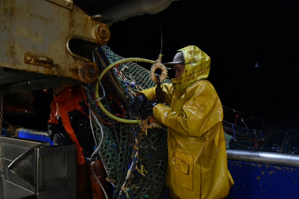 Vers 05H00 du matin, plusieurs sonneries retentissent et Pierre Leprêtre appelle par la radio de bord ses hommes d'équipage "à filer". En un éclair, les quatre hommes sont à la manoeuvre pour déployer le chalut et jeter leurs espérances à la mer, calme désormais.