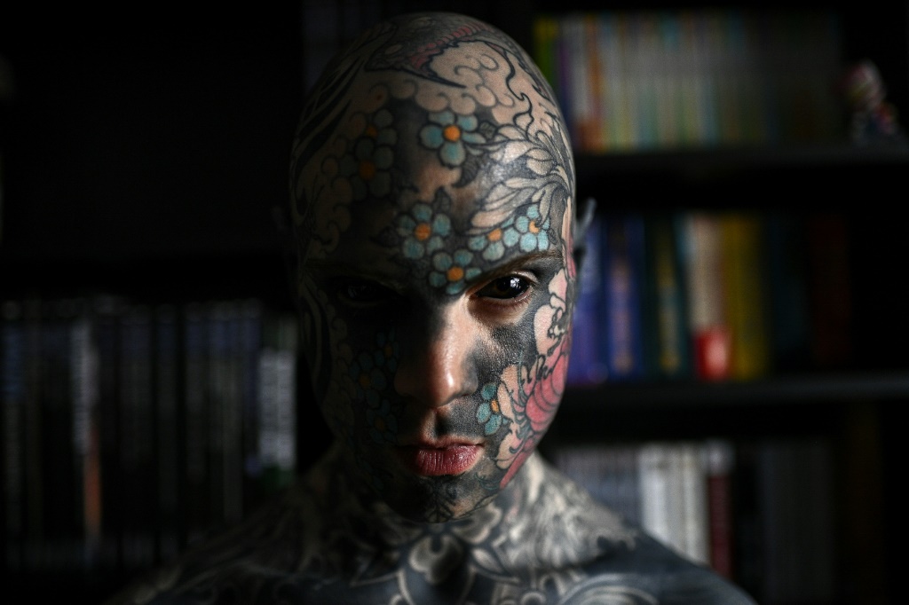 Aucune partie de son corps n'est vierge d'encre, pas même les yeux ou la langue : à Palaiseau, en région parisienne, un homme de 35 ans conjugue sa passion du tatouage avec son métier d'instituteur en école élémentaire.