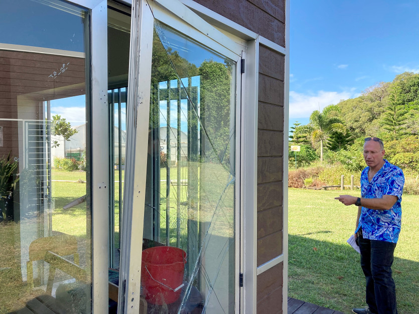 Olivier Berthelot, adjoint en charge de l’environnement, constate les dégâts à l’entrée de la cafétéria du centre. Photo Baptiste Gouret