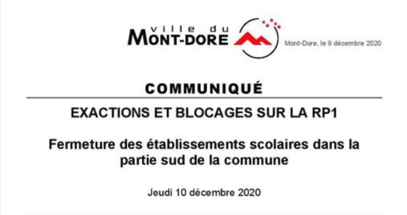 Capture d\'écran FBCette fermeture découle des exactions et blocages de la RP1, indique ce soir la mairie du Mont-Dore.La nouvelle date du début de soirée : les écoles du Mont-Dore situées dans la partie sud de la commune seront fermées demain jeudi, toute la journée.