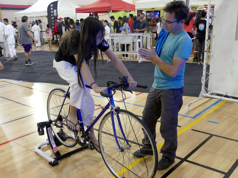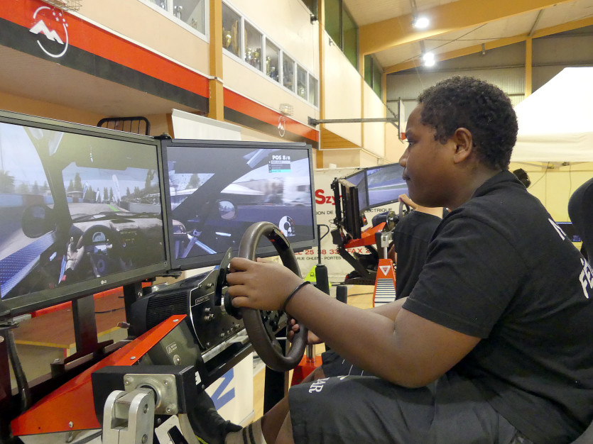 Dans la salle Henri-Sérandour, la zone est dédiée aux e-sports. Ici, un enfant s’essaye au simulateur de course de voitures. Photo Baptiste Gouret