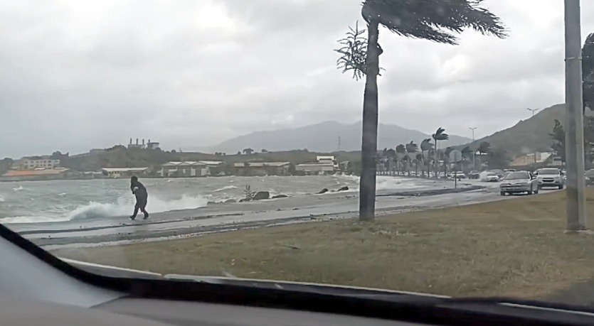 En raison des fortes rafales de vents, la route provinciale de Normandie, qui longe la SLN, est inondée. Beaucoup de déchets jonchent le bord de route.