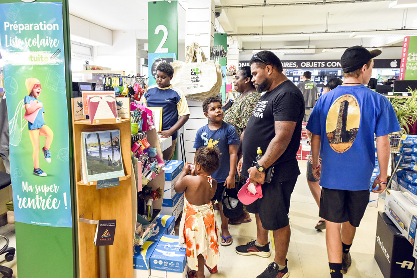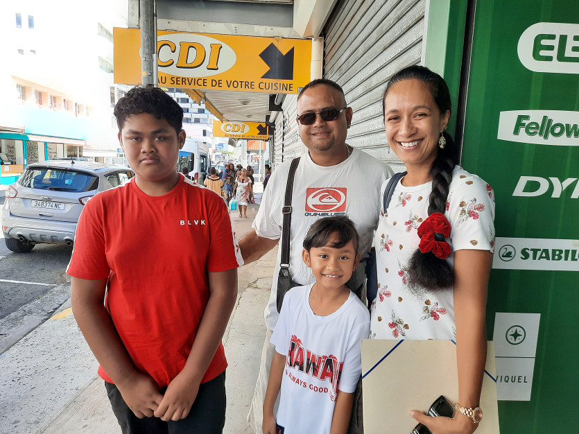 Enriqué, Rory, et leurs parents Andréa et Fabrice ont fait les derniers achats ce samedi matin au Quartier-Latin. Photo G.C.Une famille fait les derniers achats avant de retourner à Maré, juste avant la reprise. "On a fait les magasins en plusieurs fois, pour aller chercher les petits prix, à droite à gauche. On avait déjà presque tout, c’est juste pour de petites choses."