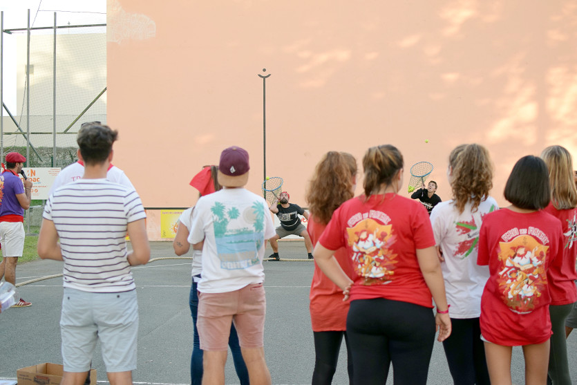 Un des coéquipiers portait un panier dans le dos et devait le remplir de plus de balles de tennis possible. Photo Cécile RubichonOu le "pack", inspiré du rugby. Harnachés à un élastique, les joueurs devaient placer un ballon de rugby le plus loin possible. Un échauffement avant d'attaquer une soirée de danses et de chants. Prochain rendez-vous : les fêtes de Bayonne le 31 juillet.