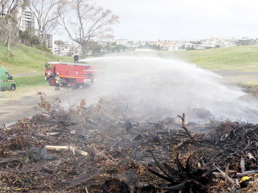 Près des tours de Magenta, des tas de végétation arrachée par le cyclone Niran ont été incendiés entre vendredi soir et samedi matin. Photo G.C.Les flammes ont prospéré sur de grandes quantités de branchages, qui avaient été emportés par le cyclone Niran, le 6 mars, puis entassés en plusieurs endroits. La forte odeur a été sentie à plusieurs kilomètres à la ronde, dans Nouméa.