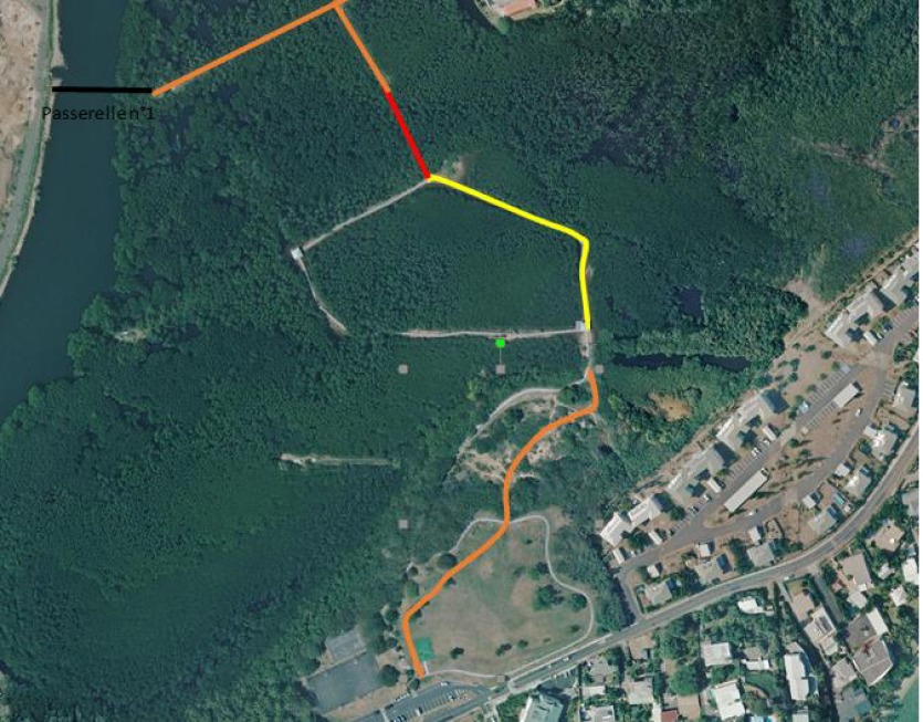 Le cheminement qui part de la passerelle, en noir, et qui va jusqu'au parking du parc de Ouémo, en face de l'école Marie-Havet. La partie en jaune représente la portion de platelage en bois qui doit être élargie.MERCI DE VOUS IDENTIFIER