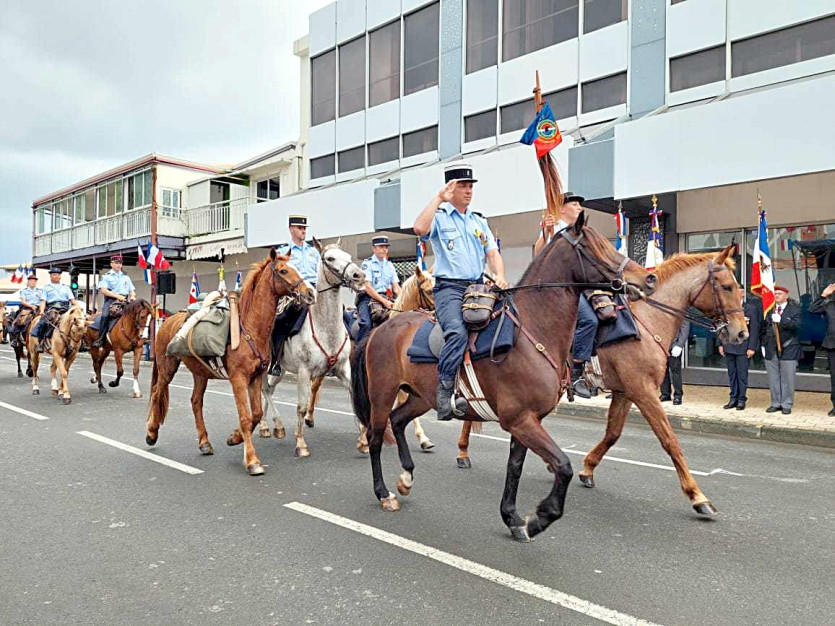 Huit cavaliers du peloton de surveillance et d’intervention à cheval de Deva, commandé par le Major Pascal Tamisier ont le fait le déplacement jusqu’à Nouméa. Photo Sarah MaquetEt lors de ce défilé les troupes du RSMA (régiment du service militaire adapté) remportent toujours un franc succès : ce sont les seules à défiler en chantant.