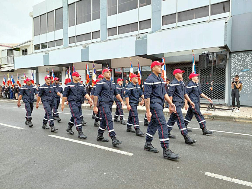 Les sapeurs-pompiers de Nouméa ont défilé pour le 14-Juillet. Le cortège est composé de différents moyens d’intervention et de secours. Photo Sarah MaquetMalgré le temps maussade, le public était au rendez-vous.