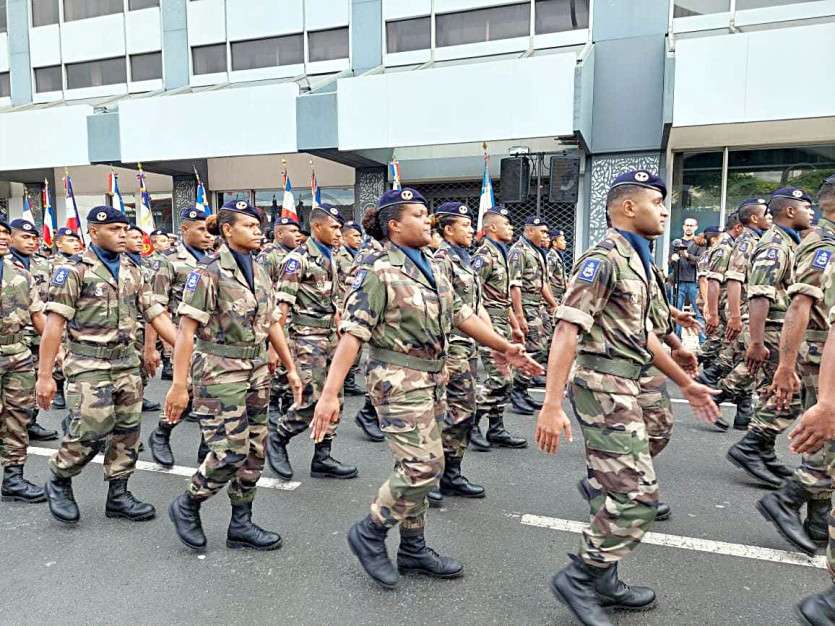 - Delphine Bossy | Crée le 14.07.2022 à 11h30 | Mis à jour le 14.07.2022 à 14h50ImprimerLa 3e compagnie de formation professionnelle de Bourail du RSMA a défilé en chantant en Nengone Nengona et a reçu un bel accueil de la part du public. Photo Sarah MaquetLe défilé du 14-Juillet est passé entre les gouttes. Malgré le temps maussade, les Calédoniens ont été nombreux à se déplacer.