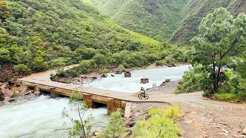 Des techniciens de la CDE à VTT, seul moyen d'accéder au barrage, pour améliorer la qualité de l'eau à Dumbéa Nord. Photo CDEMERCI DE VOUS IDENTIFIER