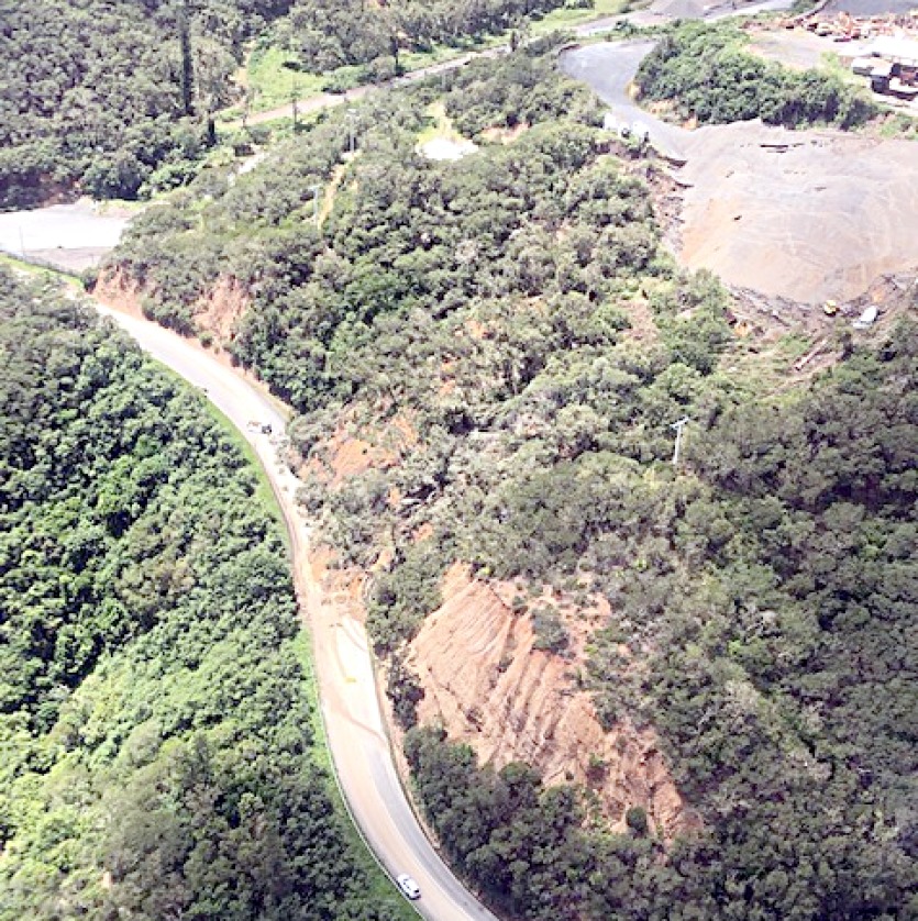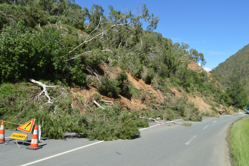 Le 6 février, un glissement de terrain avait recouvert une partie de la route de Katiramona. Il a depuis progressé et a brisé une conduite d’eau. Photo Baptiste Gouret