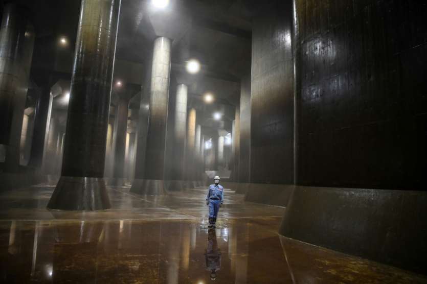 En surface, presque rien ne trahit la présence en sous-sol du réservoir principal aux allures de cathédrale du site de Kasukabe, à Saitama (nord de Tokyo), le plus grand du genre au monde. Le sol y est humide et l'éclairage faible.