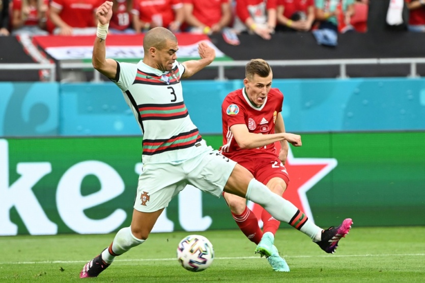 L'attaquant hongrsois, Szabolcs Schon, face au défenseur portugais, Pepe, lors de leur match (groupe F) de l’Euro 2020, le 15 juin 2021 à Budapest