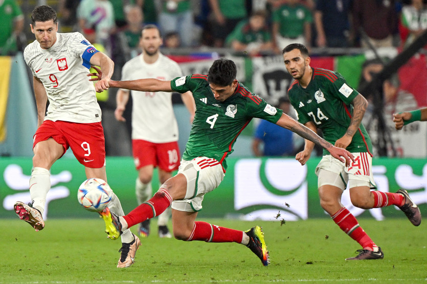 L'attaquant Polonais Robert Lewandowski tente de récupérer le ballon du milieu de terrain Mexicain Edson Alvarez. AFP - ANDREJ ISAKOVICDans le seul stade de la compétition ventilé naturellement et pas climatisé, ce n'est pas du froid que les supporters ont dû se plaindre mais bien de l'ennui.