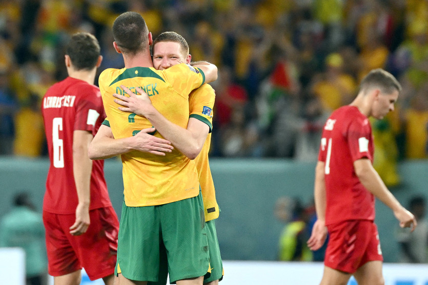 Les deux défenseurs australiens Milos Degenek et Kye Rowles célèbrent leur qualification en huitièmes après leur victoire contre le Danemark. AFP - AFP or licensors - NATALIA KOLESNIKOVAPour les Danois, qui devaient gagner pour se qualifier, tout est allé de travers puisque la modeste Australie (38e au classement mondial Fifa) s'est imposée grâce à Mathew Leckie (60e), finissant deuxième derrière les Bleus et renvoyant l'équipe scandinave à la dernière place du groupe.