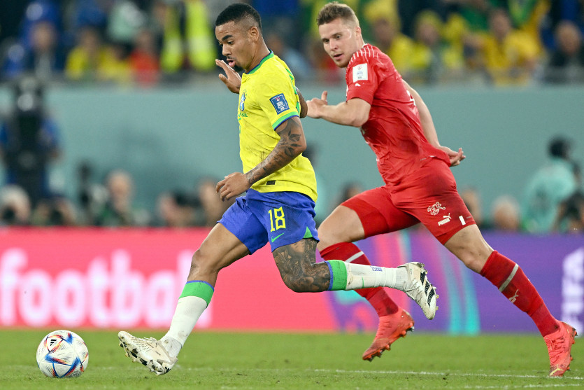 - AFP | Crée le 29.11.2022 à 07h15 | Mis à jour le 29.11.2022 à 11h31ImprimerL'attaquant brésilien Gabriel Jesus tente de garder le ballon face au défenseur suisse Nico Elvedi AFP - AFP or licensors - FABRICE COFFRINI