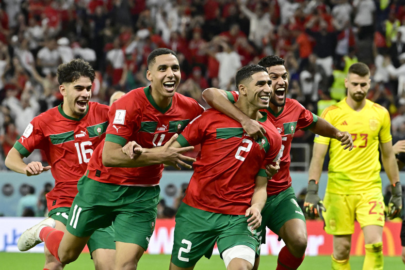 - AFP | Crée le 07.12.2022 à 06h50 | Mis à jour le 07.12.2022 à 07h09ImprimerLe défenseur marocain #02 Achraf Hakimi célèbre avec ses coéquipiers leur victoire surprise face à l'Espagne. Une victoire qui qualifie toute l'équipe en quarts de finale de la Coupe du Monde 2022 au Qatar. AFP - AFP or licensors - JAVIER SORIANO