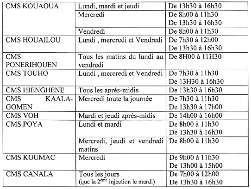 Les centres médico-sociaux de Koné, de Ouégoa, de Poum, de Pouébo, de Poindimié et de Canala seront ouverts, dès lundi, à de 7h30 à 11h30 et de 13h30 à 16h30, pour procéder aux vaccinations.