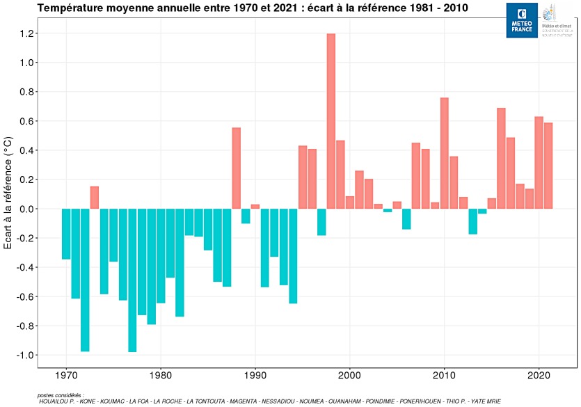 Source Météo France DRPar ailleurs, le mercure s’est également emballé puisque 2021 est la cinquième année la plus chaude enregistrée en Nouvelle-Calédonie, avec une température moyenne annuelle de 23,9 °C, soit une anomalie positive : +0,6 °C (soit la cinquième année la plus chaude depuis 1970). Autre signe du réchauffement climatique : en 51 ans, le climat calédonien s’est réchauffé de +1,2 °C.