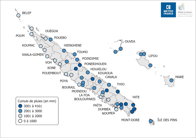 La température la plus élevée relevée a été de 36,8 °C, le 7 janvier, à la station de Port Laguerre (à Païta). La Température la plus basse enregistrée est tombée à 6,0 °C, le 19 septembre à la station de Pocquereux (La Foa).