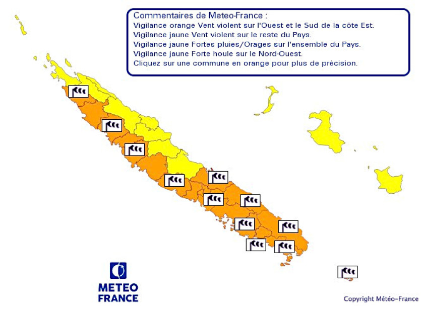 - Fortes pluies/orages sur les communes de Poum, Ouégoa, Koumac, Kaala-Gomen, Voh, Bélep, Hienghène, Poindimié, Ponérihouen, Pouébo, Kouaoua, Sarraméa, La Foa, Boulouparis, Bourail, Koné, Pouembout, Poya, Moindou, Canala, Houaïlou, Touho, Païta, Thio, Farino, Yaté, Mont-Dore, Dumbéa, Nouméa, île des Pins, Maré, Lifou, Ouvéa.