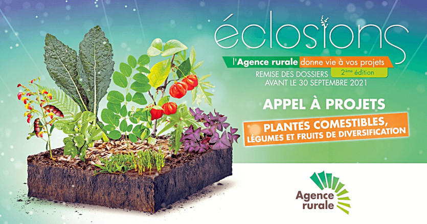 - G.C. | Crée le 18.08.2021 à 15h10 | Mis à jour le 18.08.2021 à 15h42ImprimerL’Agence rurale lance la deuxième édition de son appel à projets « Eclosions » qui a pour objectif d’encourager le développement de la production de plantes comestibles, légumes et fruits de diversification. Image Agence ruraleL’Agence rurale financera des projets destinés à "encourager le développement de la production de plantes comestibles, légumes et fruits de diversification". Les candidats peuvent postuler jusqu’au 29 septembre.