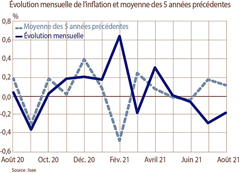 - P. Ch. | Crée le 15.09.2021 à 11h40 | Mis à jour le 15.09.2021 à 11h42ImprimerL’indice des prix baisse de 0,2 % en août, malgré une hausse notable des prix de l’énergie. Capture écran IseeL’institut de la statistique et des études économiques vient de livrer son bilan mensuel des prix à la consommation, en baisse de 0,2 %, malgré une hausse notable du prix de l’énergie.