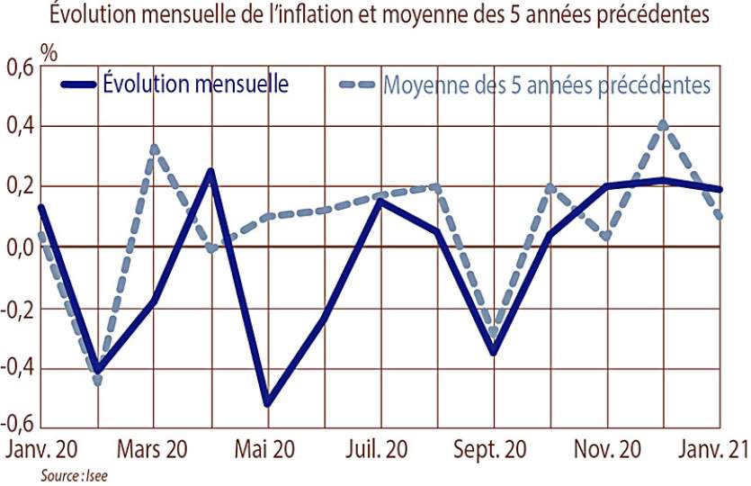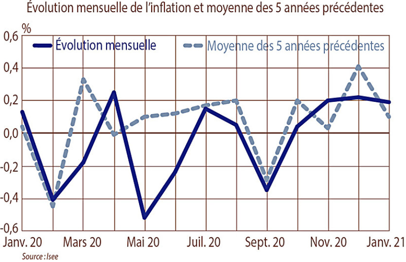 Selon l’institut de la statistique et des études économiques (Isee), l’indice des prix à la consommation hors tabac et l’indice général progressent de 0,2 % en janvier 2021 et ce, pour le troisième mois consécutif.