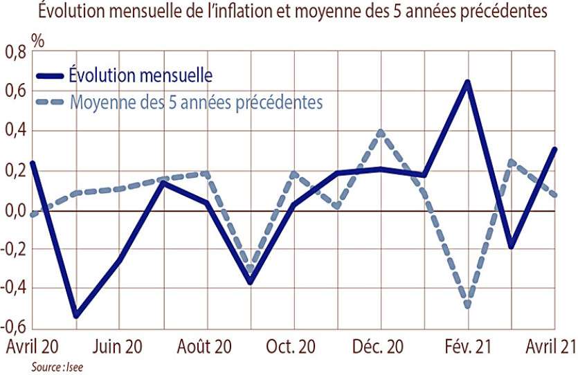 - Lucile Courtot | Crée le 12.05.2021 à 10h20 | Mis à jour le 12.05.2021 à 10h23ImprimerÉvolution mensuelle de l’inflation et moyenne des cinq années précédentes en Calédonie. Photo IseeL’institut de la statistique et des études économiques (Isee) vient de publier l’indice des prix pour le mois d’avril 2021.