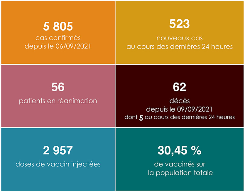 - Le gouvernement vient de communiquer le bilan sanitaire quotidien.523 nouveaux cas viennent d’être recensés au cours des dernières 24 heures, indique le gouvernement dans son point sanitaire quotidien, portant le nombre total de cas à 5 805 cas confirmés depuis le 6 septembre, date des trois premiers cas autochtones. Depuis le 9 septembre, date duIl vous reste 71% de l'article à découvrir.Cet article est réservé aux abonnés.