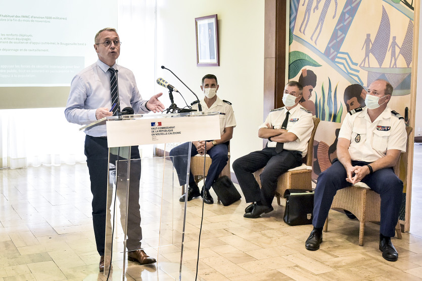 - Jean-Alexis Gallien-Lamarche | Crée le 22.10.2021 à 15h05 | Mis à jour le 23.10.2021 à 16h07ImprimerConférence de presse pour la présentation de la manœuvre en renforts des forces de l’ordre au Haut Commissariat Photo Nicolas Petit - photo Nicolas PetitLe haut-commissaire Patrice Faure a présenté la manœuvre en renforts pour la consultation référendaire.