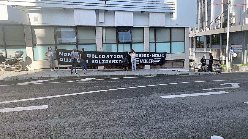 Devant le siège d’Aircalin, à Nouméa, des salariés de la compagnie aérienne internationale ont répondu à l’appel de l’USTKE. Ils ont placé une banderole "Laissez-nous voler".