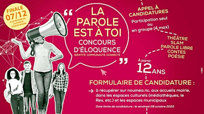 - | Crée le 14.10.2022 à 10h15 | Mis à jour le 14.10.2022 à 10h17ImprimerAffiche "La parole est à toi", première édition du concours d'éloquence organisé par la Ville de Nouméa PhotoLancé par la ville de Nouméa, ce concours est adressé aux Nouméens âgés de 12 à 26 ans.