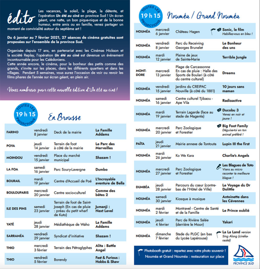 La programmation détaillée de l'opération « Un été au ciné ». capture écran document province SudPlus d'informations à retrouver dans votre journal de demain mercredi, en pages Grand Nouméa.