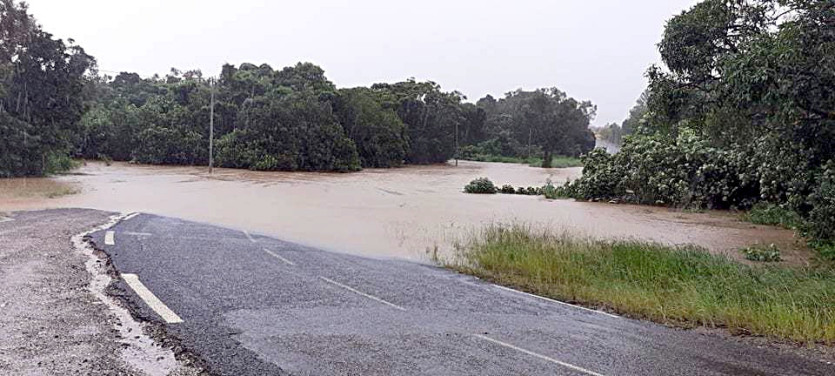 Route inondée à Poum. Photo Mairie de Koumac[10h25] Plusieurs axes sont déjà coupés en raison d’inondations selon le SIVM Nord (qui couvre les communes de Poum, Koumac et Kaala-Gomen) : il s’agit notamment des secteurs de Golone, de Malabou, Néhoué, radiers de La Fridoline et du SMA, ainsi qu’à Naraï (à Arama) et à La Roche.