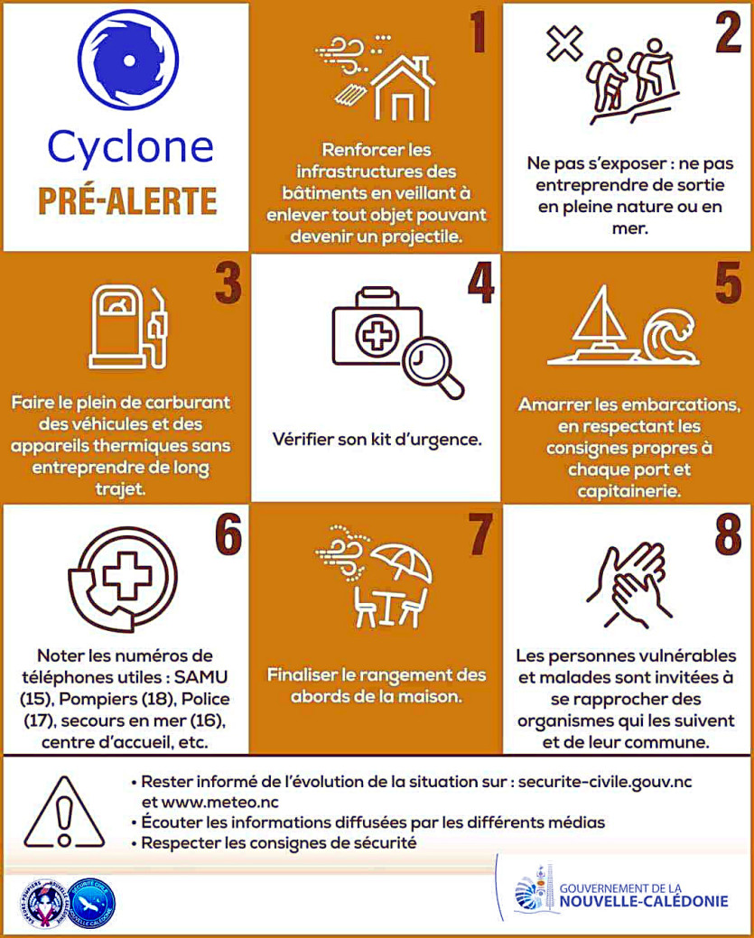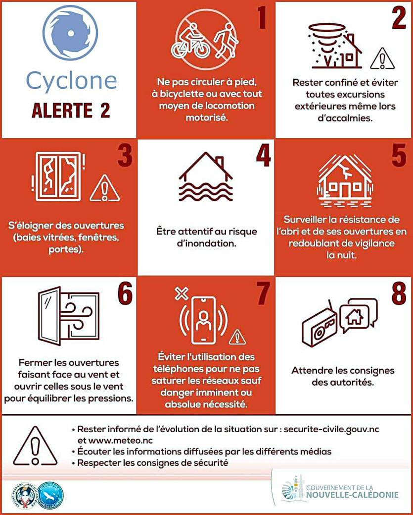 [18h10] L’alerte 1 est déclenchée pour les communes de la province Nord (celles qui étaient jusque-là encore en préalerte) depuis 18h. L’alerte 2 sera déclenchée demain à partir de 6 h pour ces mêmes communes. À Bélep, l’alerte 2 sera levée à partir de 12 h. Le reste du pays est en pré-alerte. La sécurité civile se réunira de nouveau demain, dès 6 h, pour faire évoluer ce dispositif en fonction de la situation.