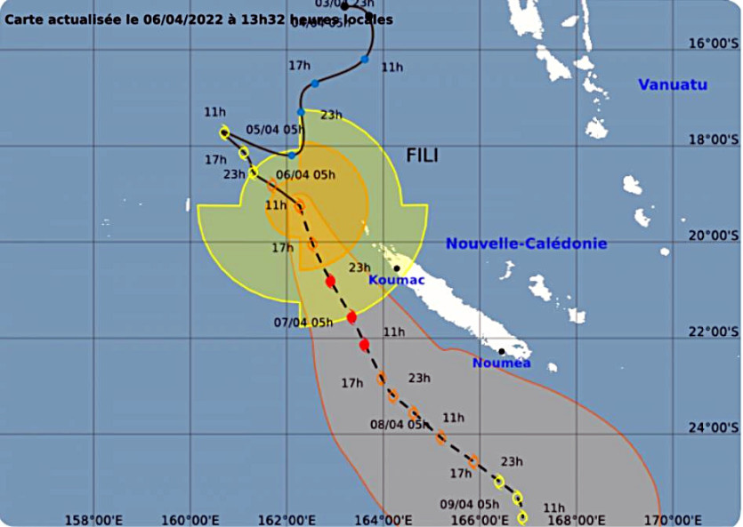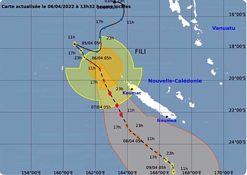 Dans les prochaines 24 heures, Fili continuera de se déplacer vers le sud sud-est en se renforçant lentement. Le centre passera à environ 170 km dans l’ouest de Bélep en fin de journée, puis à 190 km de Koumac la nuit suivante, selon les prévisions de trajectoires de Météo France.