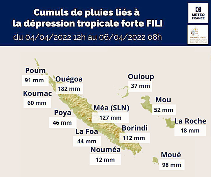 Sur les 24 dernières heures, il est tombé 60 à 110 mm de pluie sur la côte Est, le Nord et l’île des Pins. Des rafales à 120 km/h ont été mesurées sur l’île de Surprise, à D’Entrecasteaux. À Poingam, elles atteignent 100 km/h.