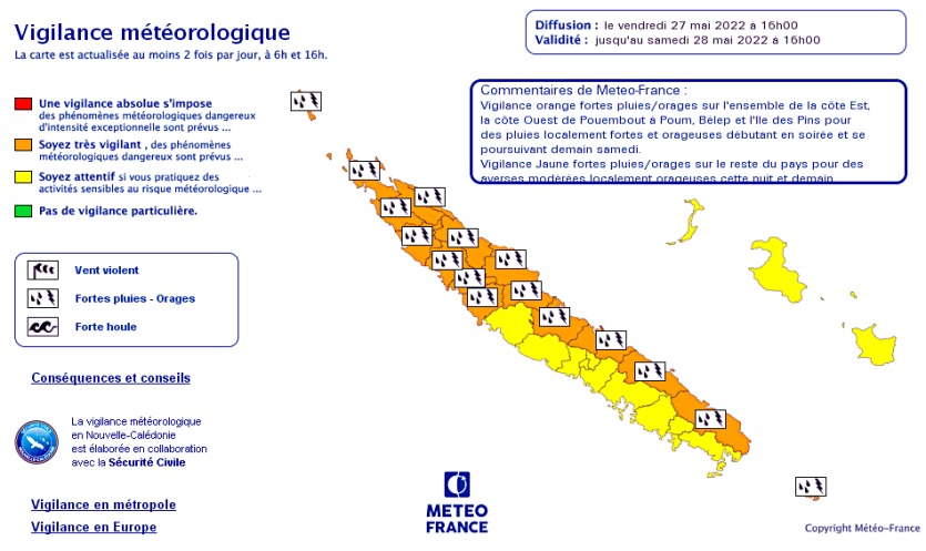 Une vigilance orange fortes pluies et orages est activée par la Sécurité civile à partir de 18 heures, ce vendredi, et jusqu’à demain, samedi, à midi, sur les communes de : Pouembout, Koné, Voh, Kaala-Gomen, Koumac, Poum, Bélep, Ouégoa, Pouébo, Hienghène, Poindimié, Touho, Ponérihouen, Houaïlou, Kouaoua, Canala, Thio, Yaté et l’île des Pins.